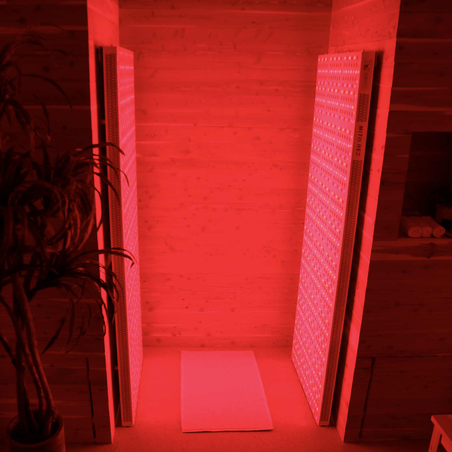 UPK’s vertical red light panels are fixed in an open-sided cedar booth within a private room. Panels are 26 inches wide, 76 inches tall, and stand 40 inches apart, providing sufficient coverage for a truly enveloping standalone experience, or as a compliment to SoftWave TRT.